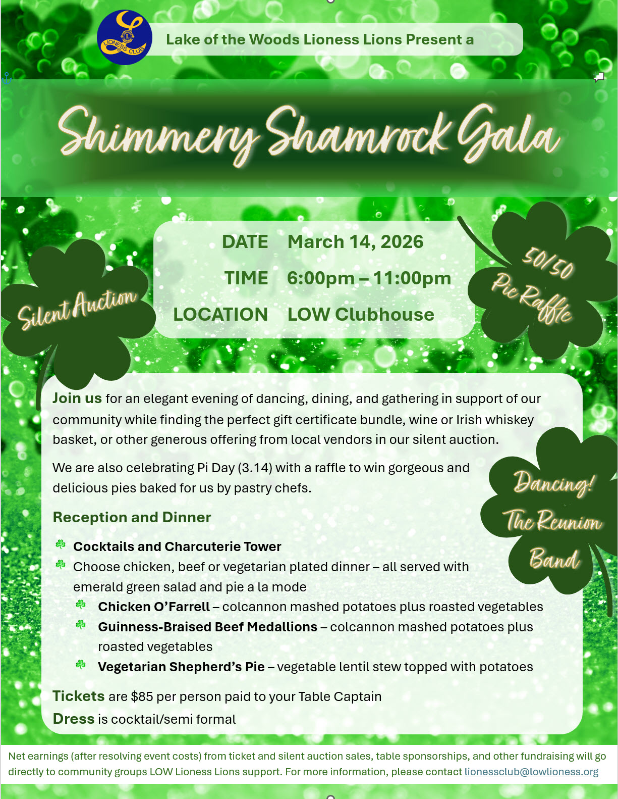 For public ticket availability to the Shimmery Shamrock Gala on March 14, please contact Nicki Buell at nbuell113@comcast.net.